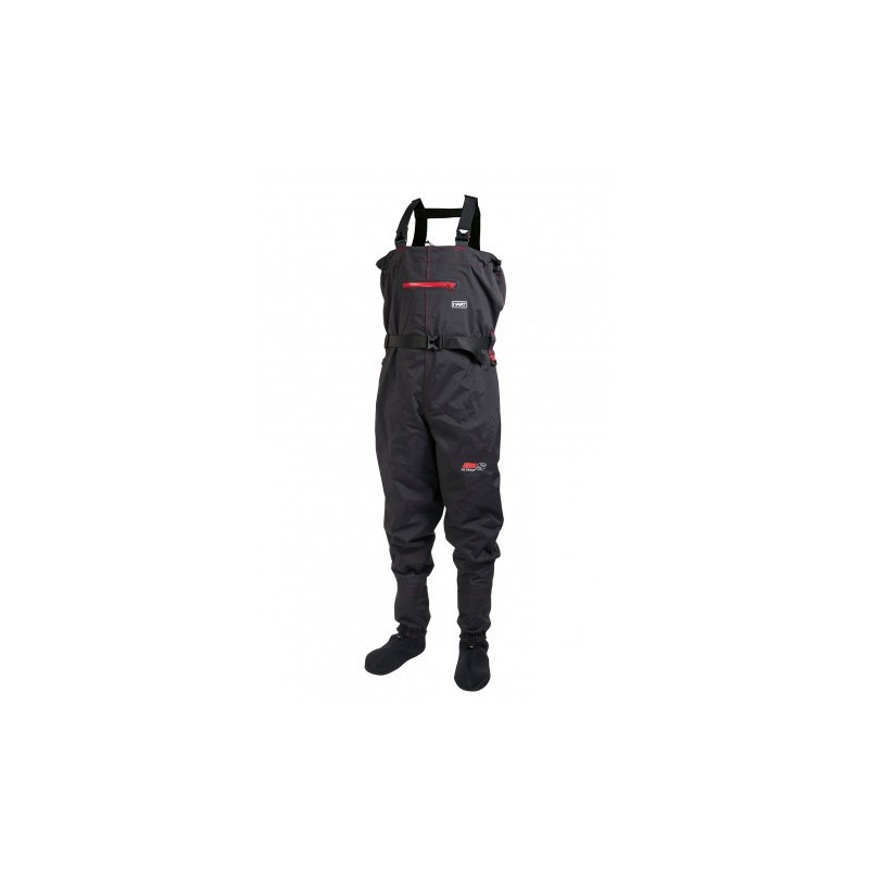 - Al combinar los enganches macho/hembra del pecho permite plegar el vadeador hasta la cintura y sujetarlo convirtiendo dichos tirantes en cinturón. -Cinturón regulable con guía de gruesas trabillas reforzadas.