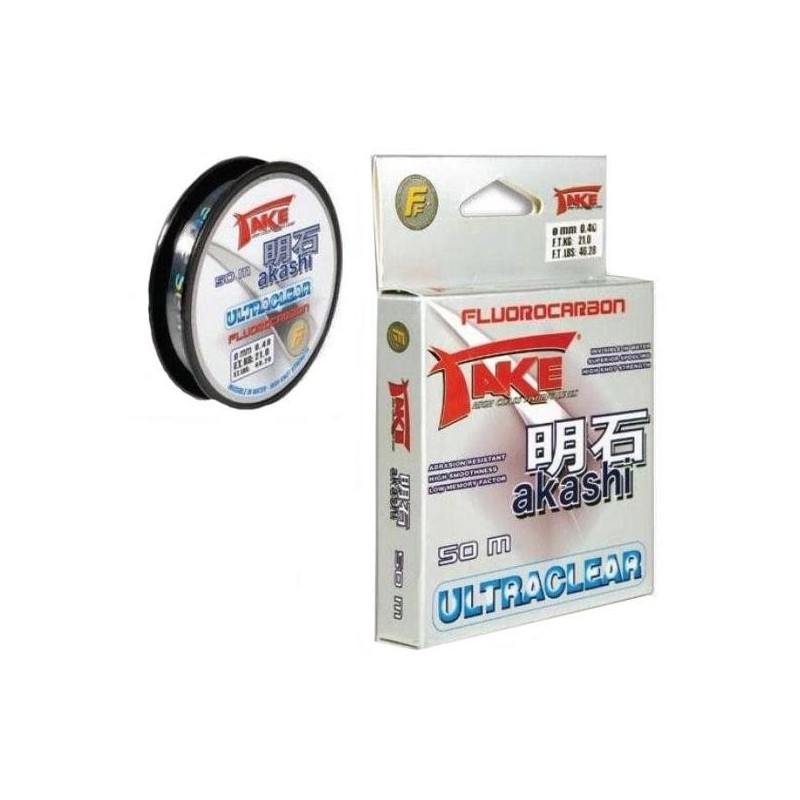 TAKE AKASHI ULTRACLEAR 50 METROS Fluorocarbono ideal para la realización de bajos de líneas transparentes y reflectantes en el agua y, por lo tanto, invisibles para la presa. Excelente relación diámetro-kg mantenida con potencia de carga, alta resistencia al nudo y desgarro. El Akashi ultraclear de Take se impone en el mundo de la pesca garantizando la fiabilidad, la resistencia y la economía, por estas características es muy apreciado tanto por los profesionales como por los pescadores. Ausencia total de memoria. Alargamiento inexistente. Completamente invisible.